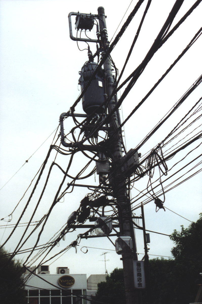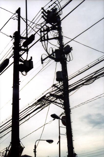 Well I did take a whole lot of pictures when I was in Japan, but as yet I haven't really bothered to scan them all. Or really any of them. But there was a photo thread on something awful, and I decided to post a couple of my telephone pole shots. Tokyo, and Japan in general, has some of the most ridiculous telephone poles you've ever seen. It seems they just throw up any wire they please, whether it's needed or not. Anyway, I thought it would be good fodder for ARTSY PHOTOS! |